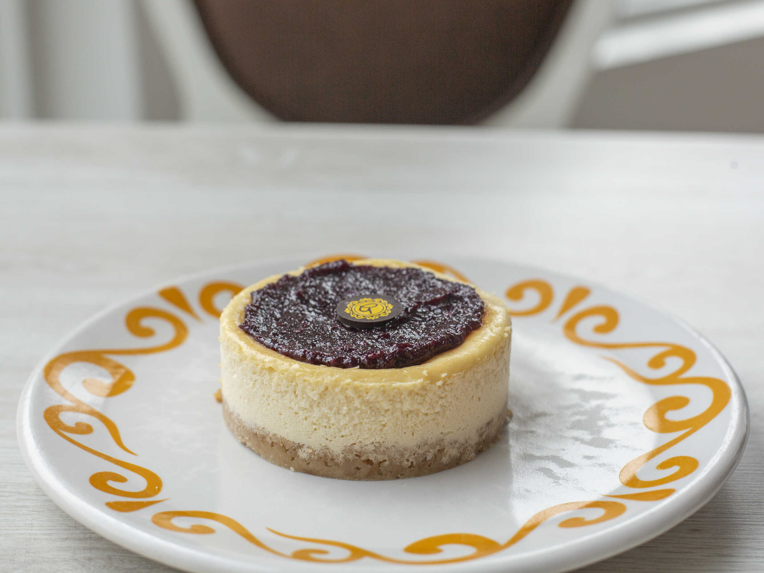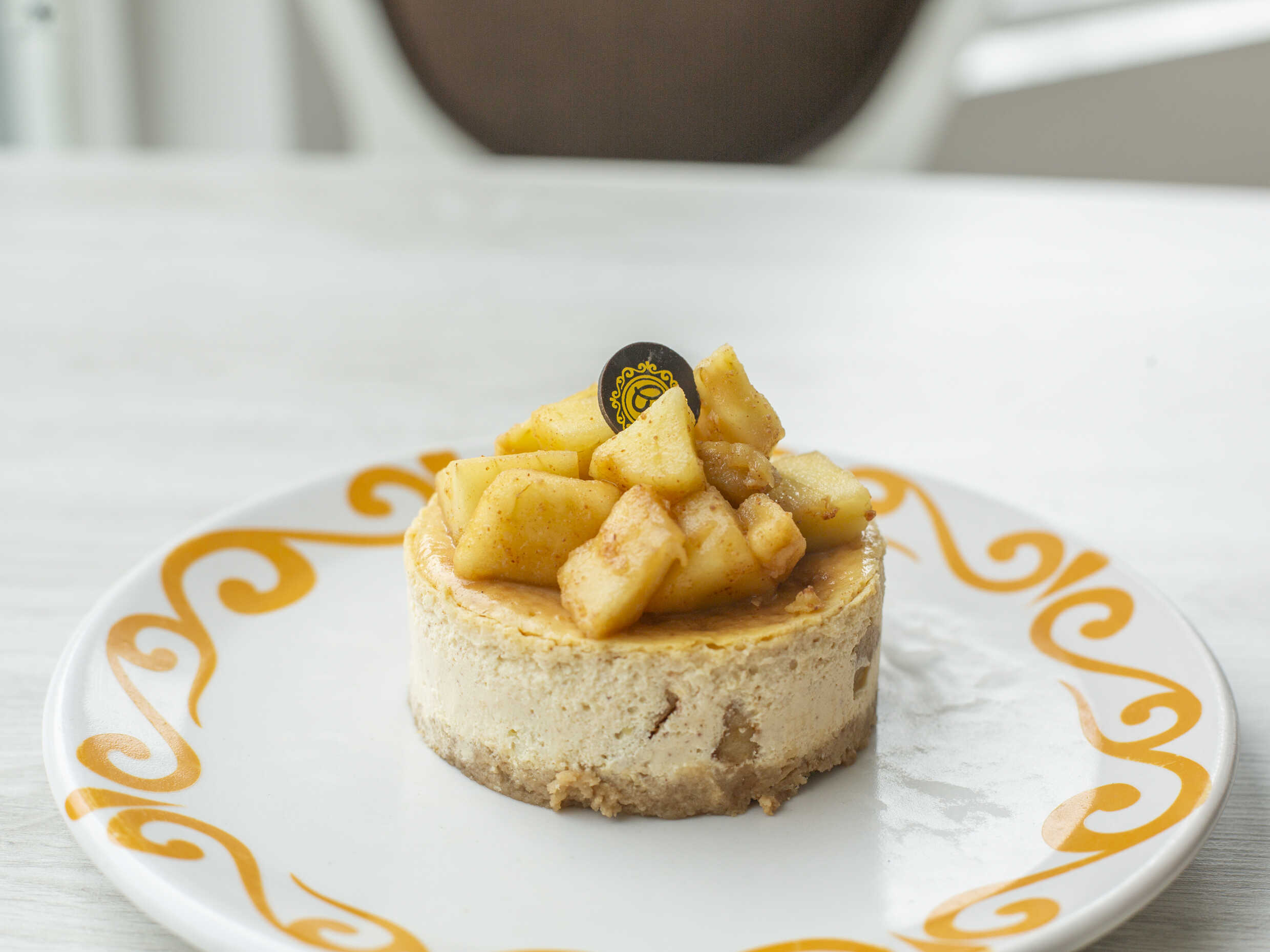 Delicioso cheesecake relleno y decorado con manzana con canela.