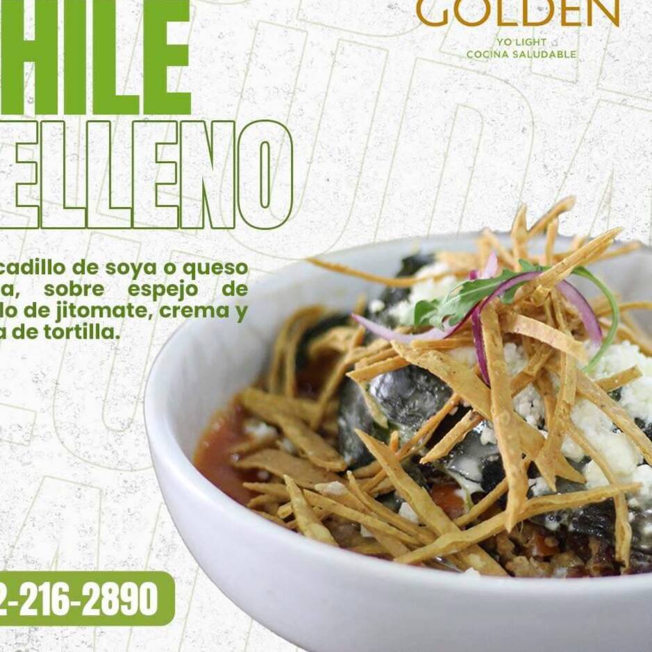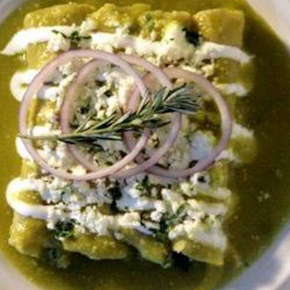 Rellenas de soya , queso o pollo bañadas en salsa roja o verde al cilantro.