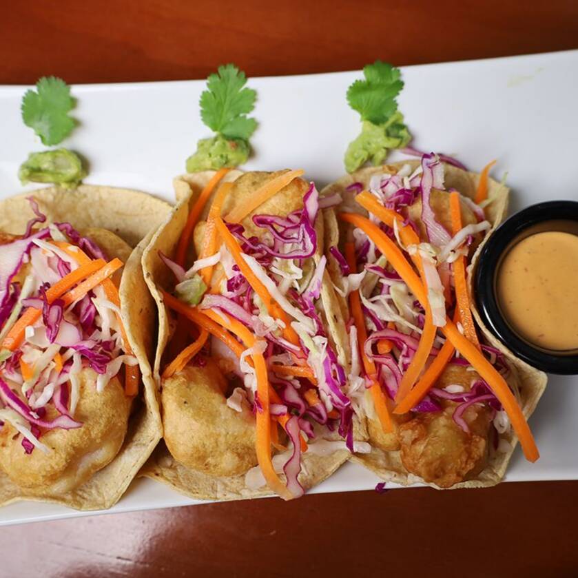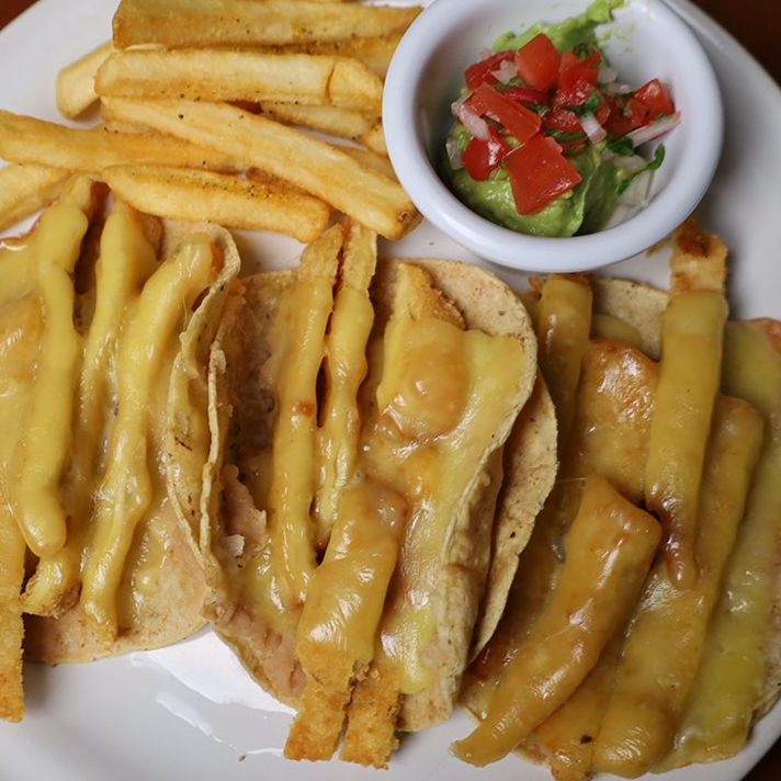 Tacos de milanesa de pollo o gluten , con frijoles gratinados, acompañados de guacamole y papas a la francesa