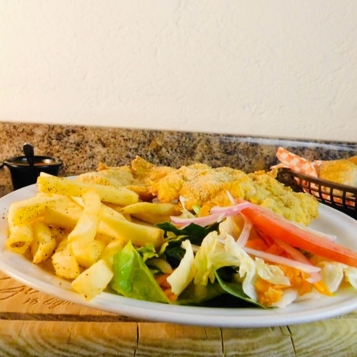 milanesa de polo gratinada con jamón , bañada de salsa pomodoro acompañada de ensalada