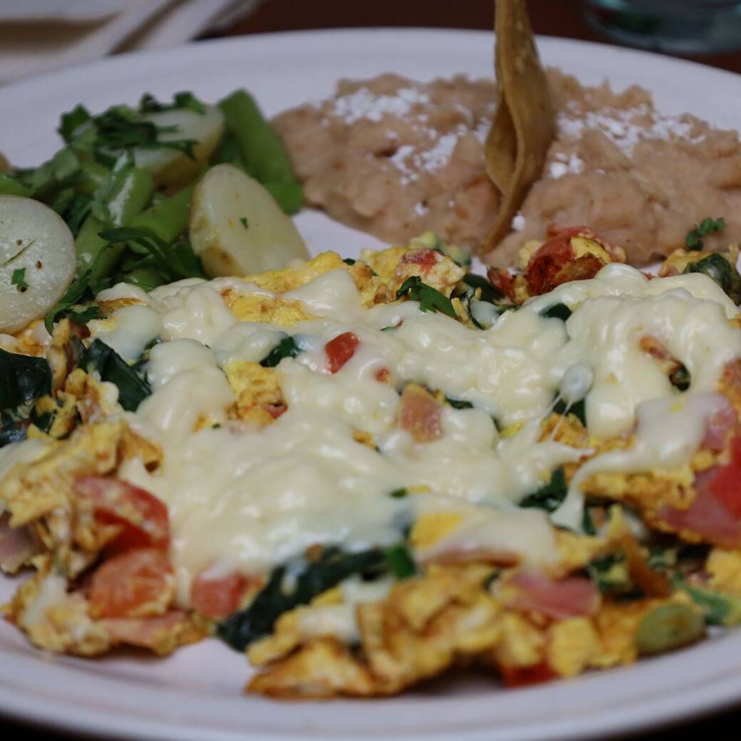revueltos con espinaca, jitomate, jamon de pavo, gratinados, acompañados de frijoles y papas con ejotes