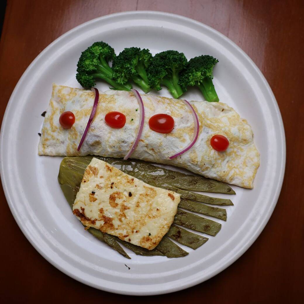Relleno de champiñón, acompañado de queso panela, brócoli y nopal asado