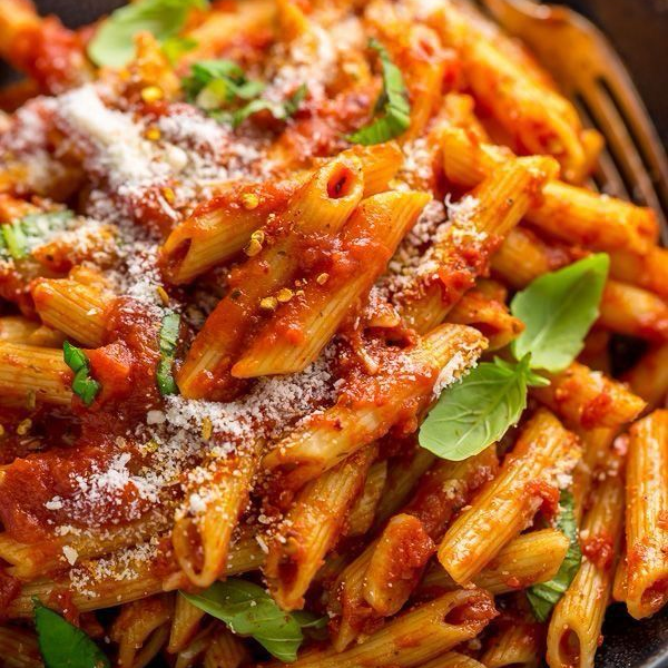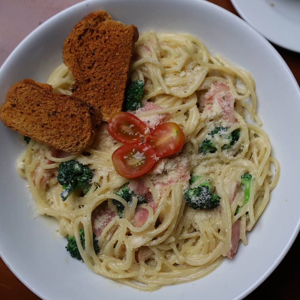 Espagueti acompañado de jamón, brócoli y cremosa salsa Alfredo