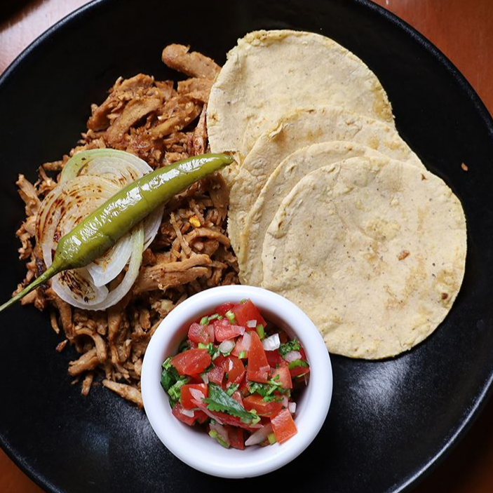 Pechuga de pollo asada, queso Oaxaca, chorizo de soya, rajas, acompañada de cebolla caramelizada y salsa macha, con guarnición de papa adobada