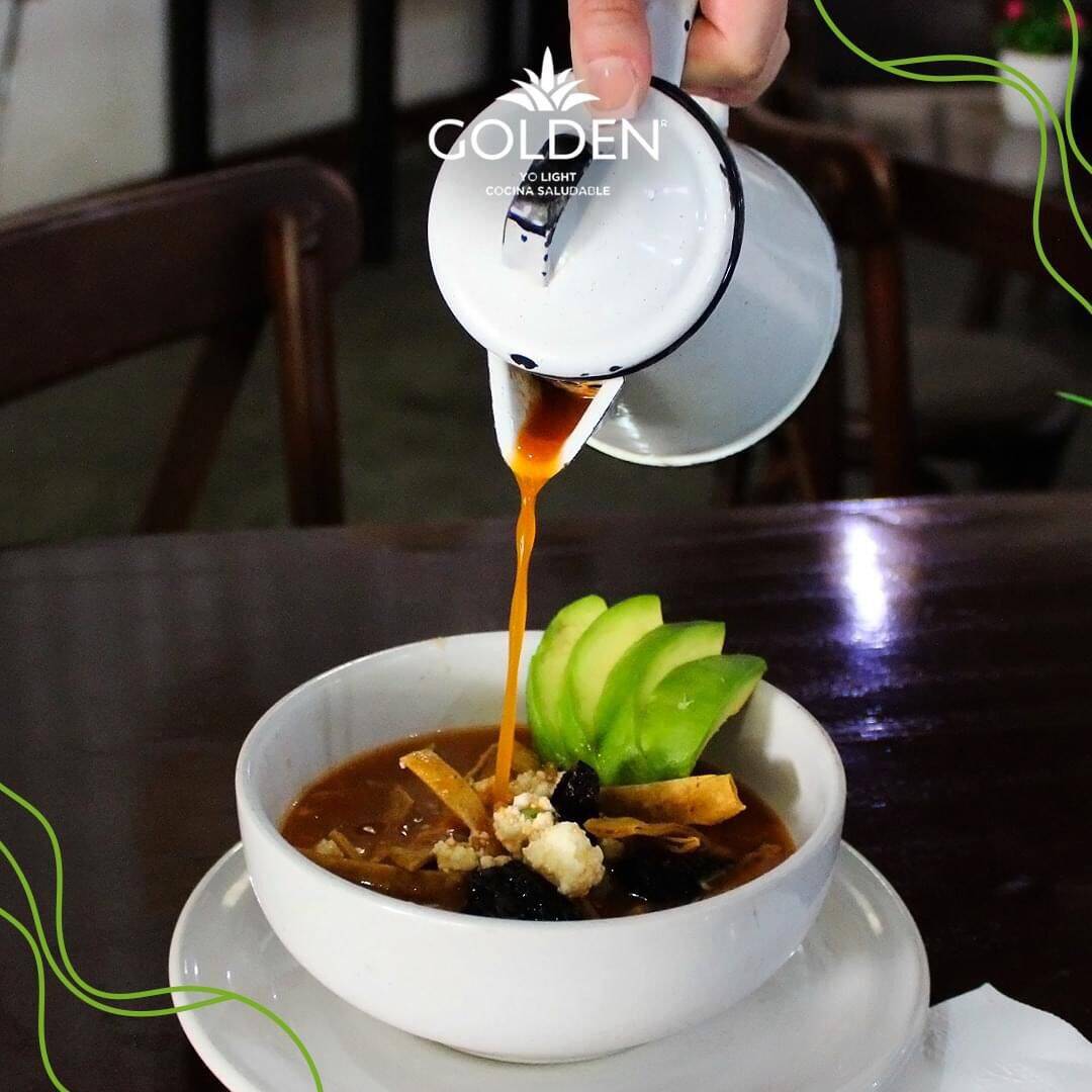 Juliana de tortilla dorada en caldillo de jitomate con chipotle , crema, queso ranchero, aguacate y chile tostado