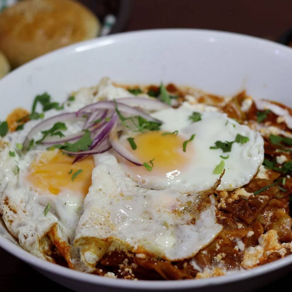 Tortilla crocante sumergida en salsa roja, verde o morita