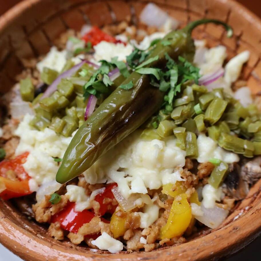 Soya , mix de pimientos , cebolla, champiñón , gratinado con nopales y chiles toreados