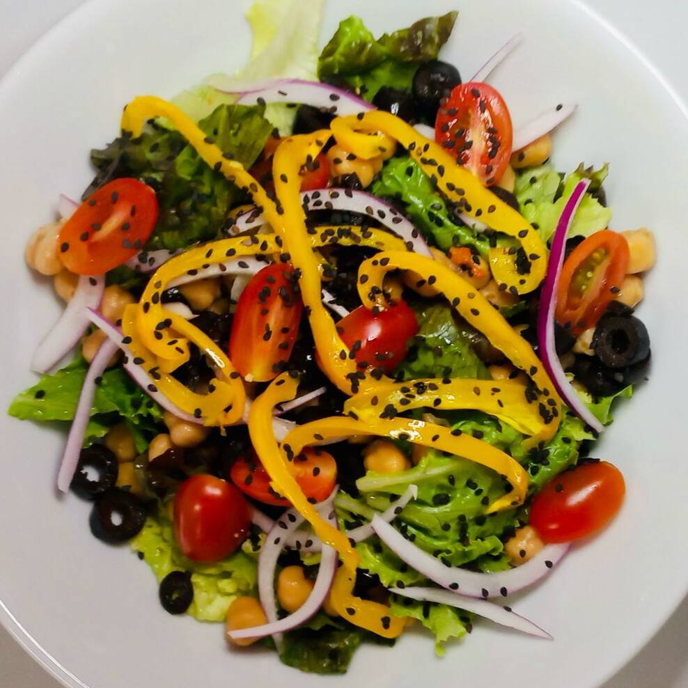 Combinacion de lechuga , espinaca, jitomate cherry, aceitunas negras , garbanzos cebolla morada , pimiento rostizado y ajonjolí negro