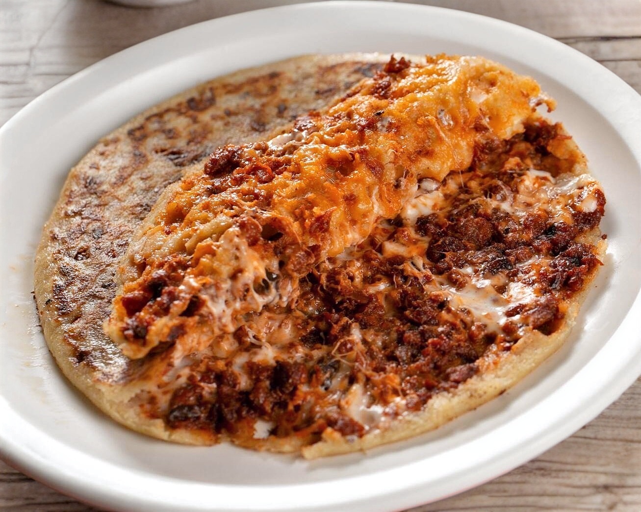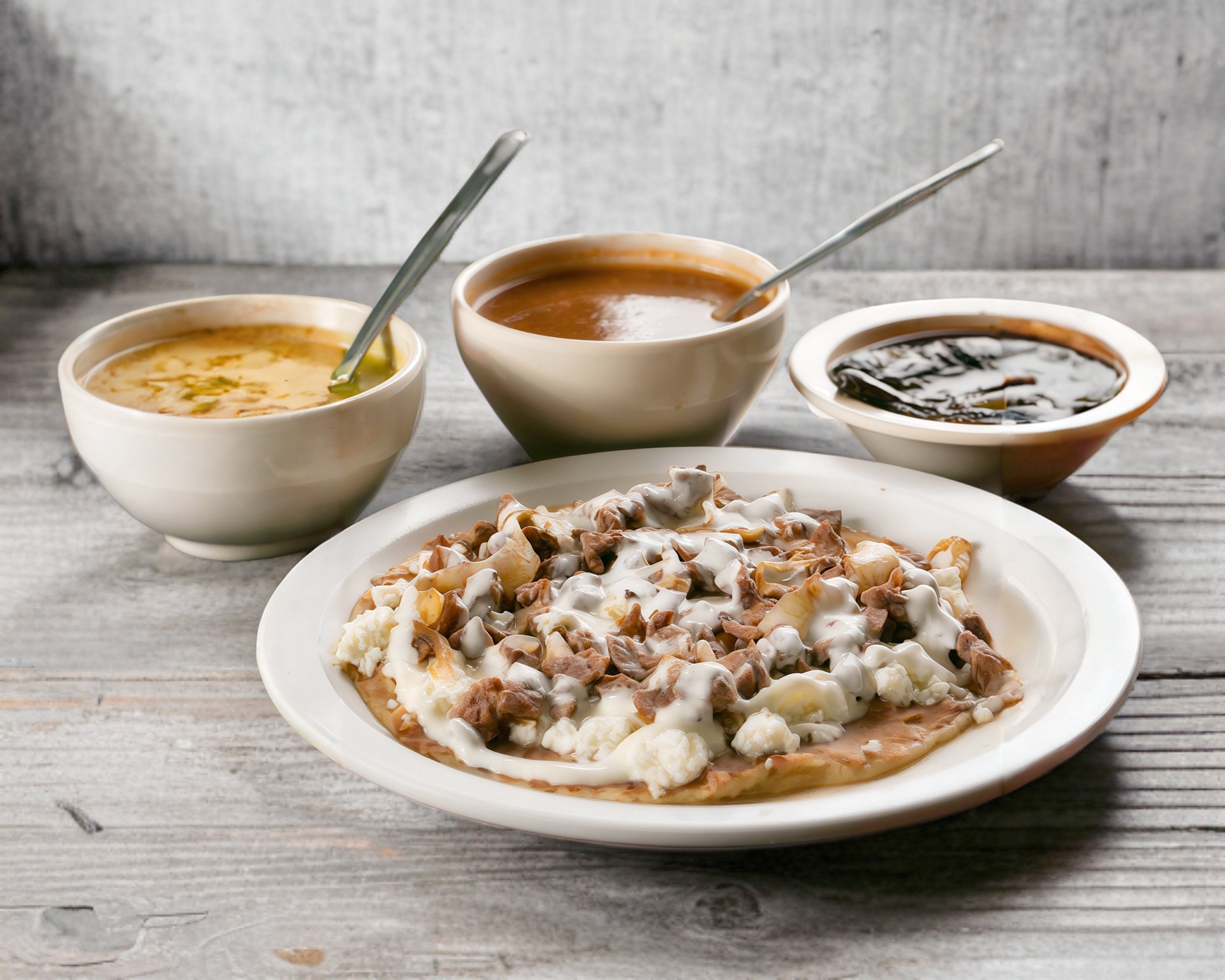 100gr de Bistec, 100gr de queso oaxaca, frijoles, cebolla y crema.