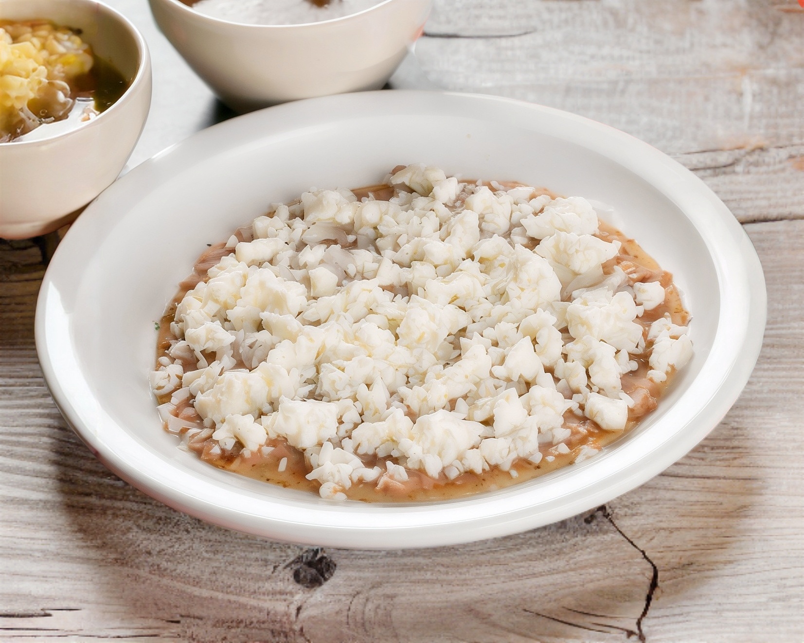 80gr de Migaja, 80gr de queso panela, frijoles, cebolla y crema.
