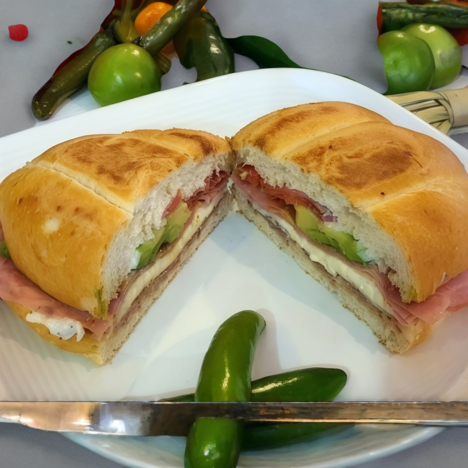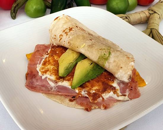 2 rebanadas jamón de pavo, 50gr de queso Oaxaca, aguacate, jitomate, frijoles y crema.