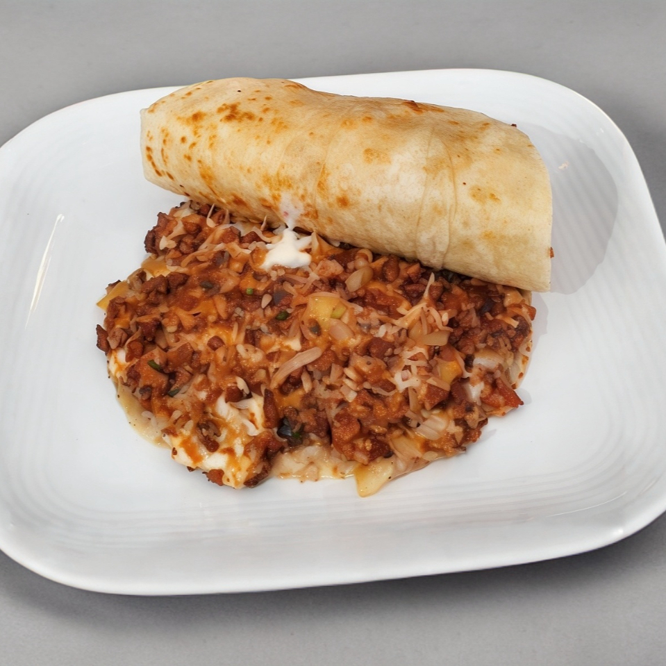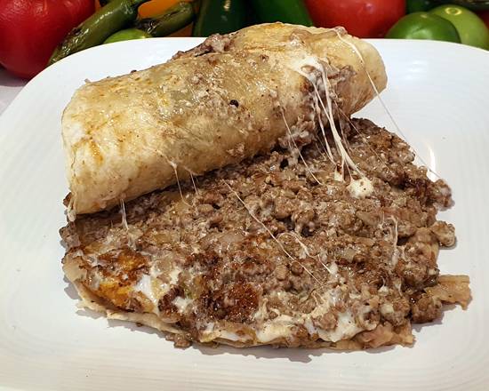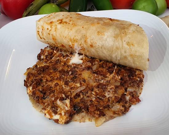 2 tortillas de harina, 100gr de bistec, 50gr de queso Oaxaca, cebolla y frijoles.