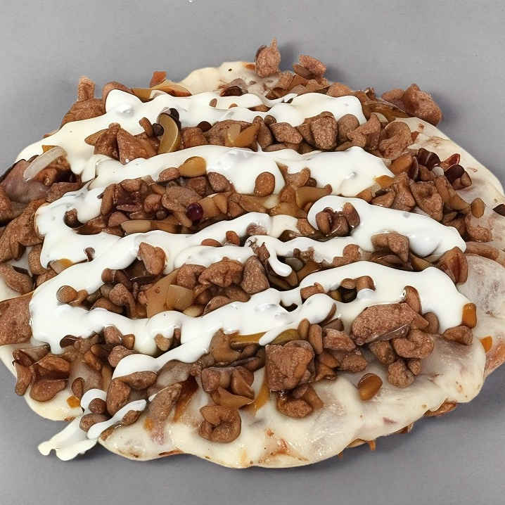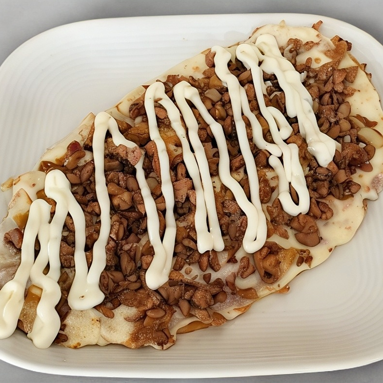 2 tortillas de harina, 80gr de migajas, 50gr de queso Oaxaca, cebolla y frijoles.