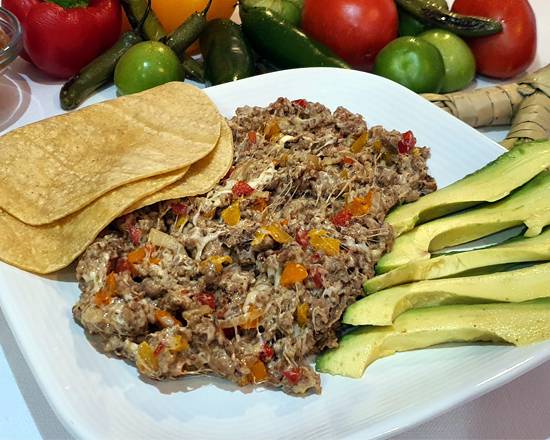 100gr de bistec, 80gr de migaja, 100gr de queso Oaxaca, cebolla, pimiento, aguacate y 8 tortillas de maíz.