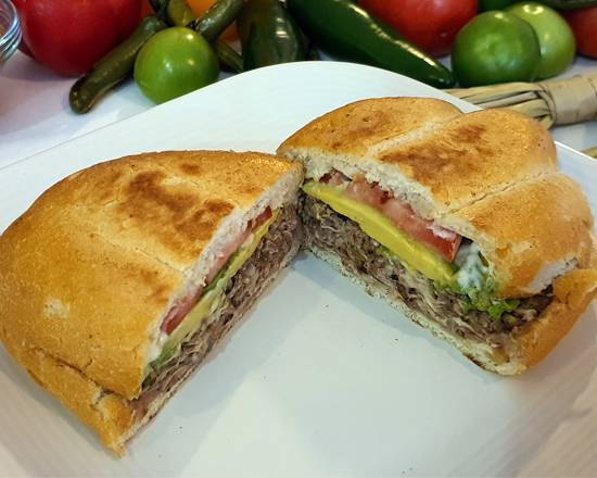 100gr de bistec, 50gr de queso Oaxaca, aguacate, jitomate, frijoles, cebolla y crema.