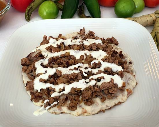 100gr de bistec, 100gr. de queso Oaxaca, frijoles, cebolla y crema.