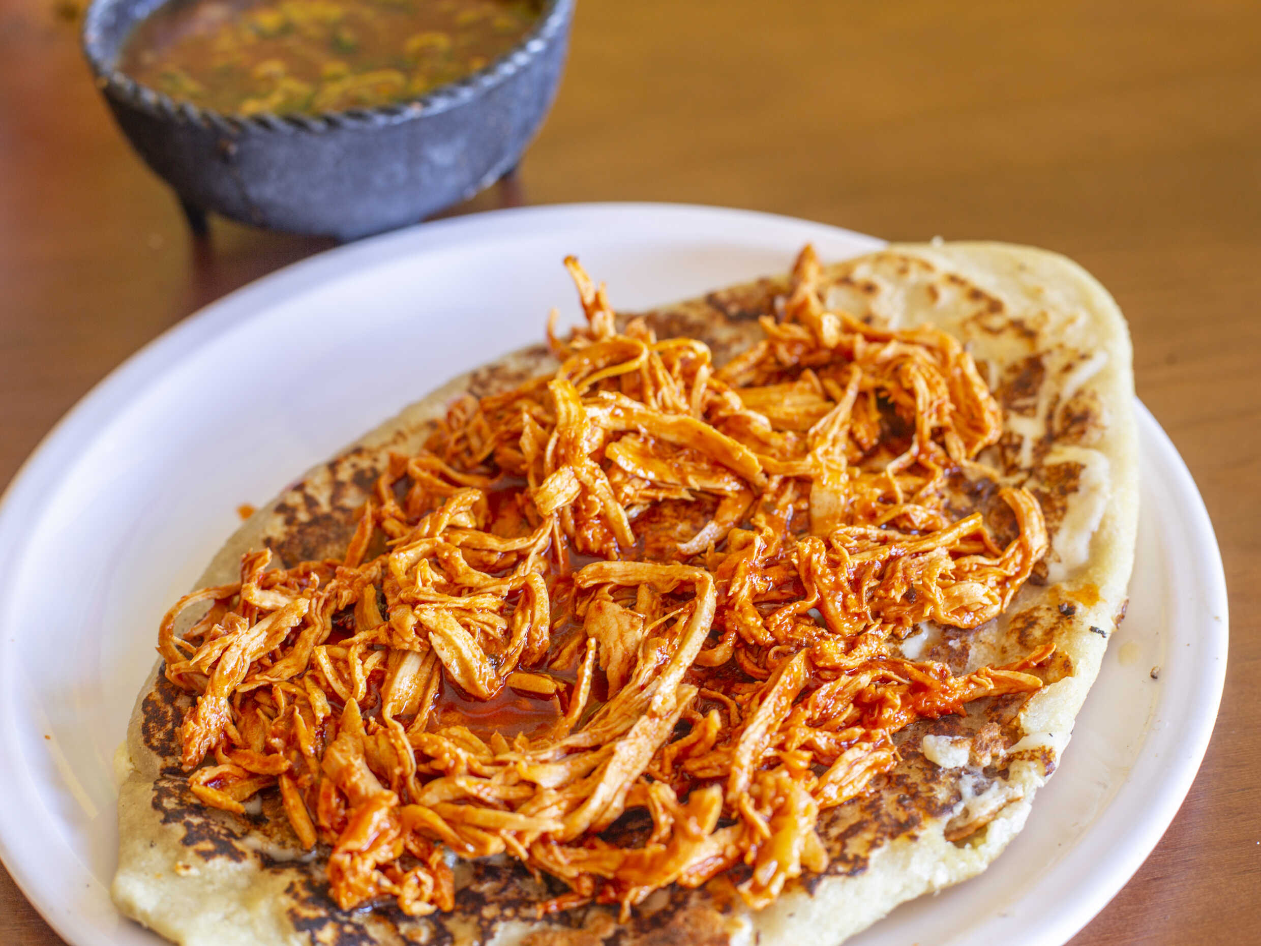 Exquisita gordita rellena con una deliciosa combinación de pollo tierno y sabrosos ingredientes.