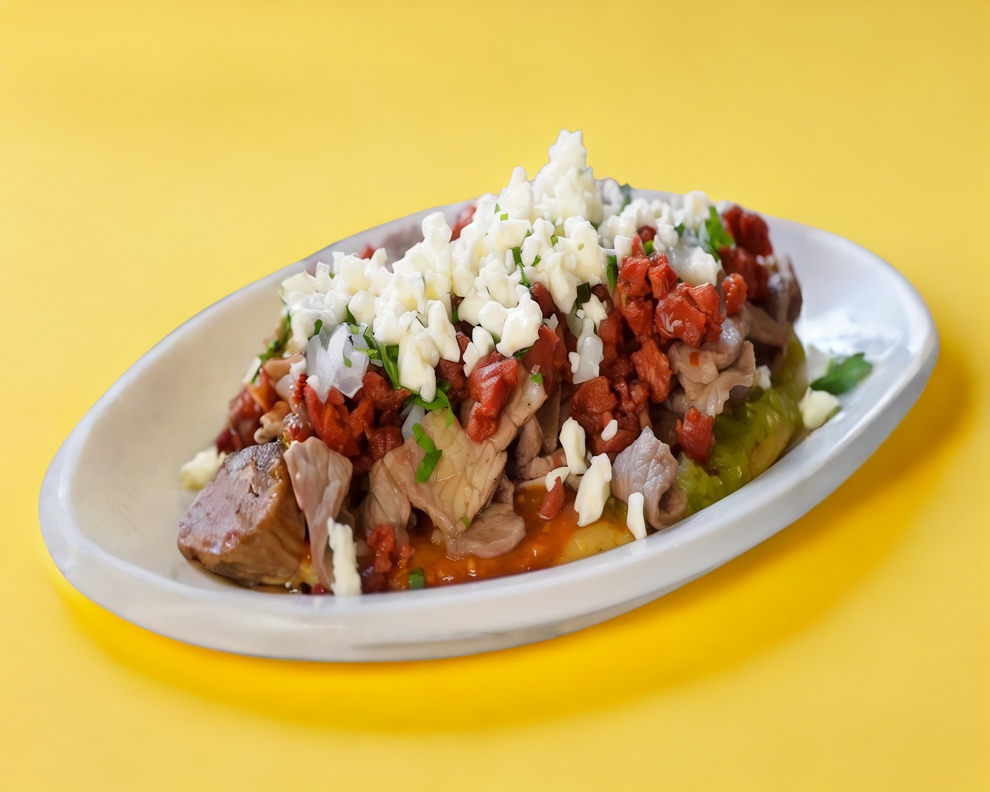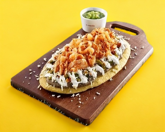 Tortilla de masa de maíz gruesa rellena de frijol, acompañado de queso oaxaca, bistec y longaniza, 1 pz.