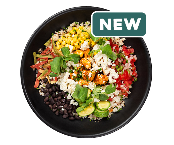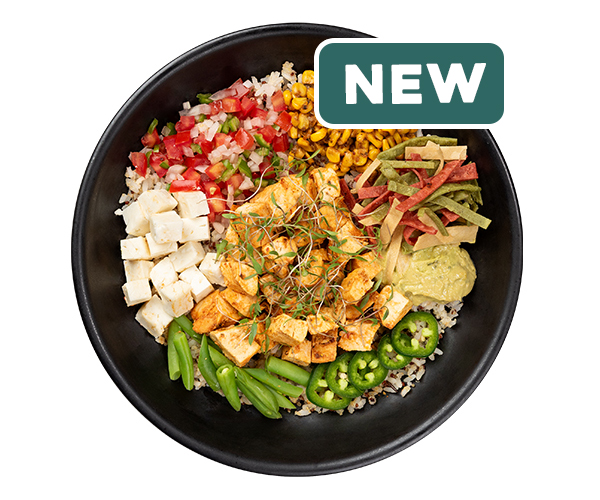 Pollo en salsa Loussiana, queso adobera, frijol negro, elote amarillo, calabaza, pico de gallo, mix de tortillas, cebollín. Aderezo creamy chipotle.