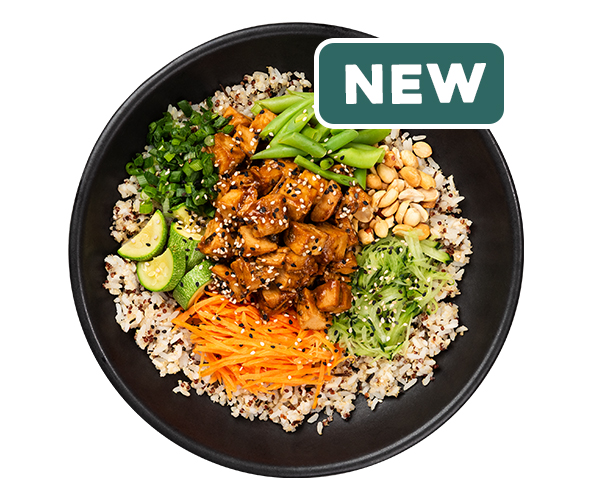 Pollo en salsa teriyaki, pepino, zanahoria, ejote, cebollín, calabaza, cacahuate, mix de ajonjolí y Aderezo Mango Jenjibre.