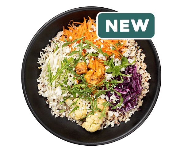 Pollo en salsa buffalo, queso de cabra, coliflor asada, col morada, zanahoria y arugula fresca. Aderezo Blue Cheese.