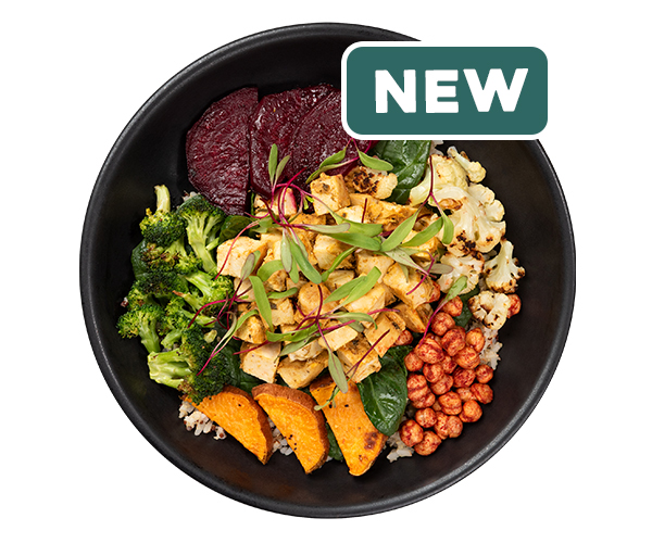 Pollo Grill, betabel rostizado, coliflor, camote rostizado, brócoli, espinaca, tomate cherry, garbanzos crujientes, cilantro picado. Aderezo Thai
