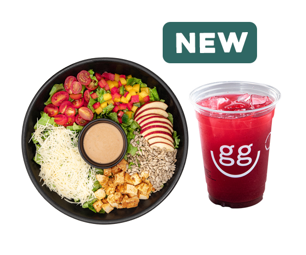 Pollo grill, tocino, apio, camote rostizado, mango, pepino, cebolla morada, limón, cebolla frita, cebollín, espinaca, mezcla de lechugas. Aderezo aguacate y aderezo de mango jengibre.
