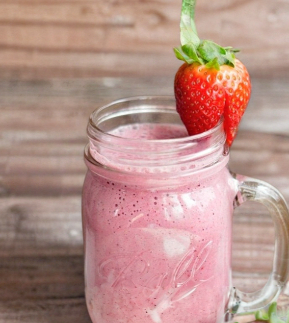 Batido base yogurt griego y leche a elección, fresa, avena, semilla de linaza y almendra.