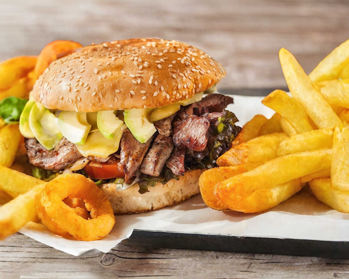 pan para hamburguesa, carne de res, queso blanco, queso amarillo, jamon, aros de cebolla, cebolla frita, aguacate, chiles en vinagre, mayonesa, catsup y mostaza