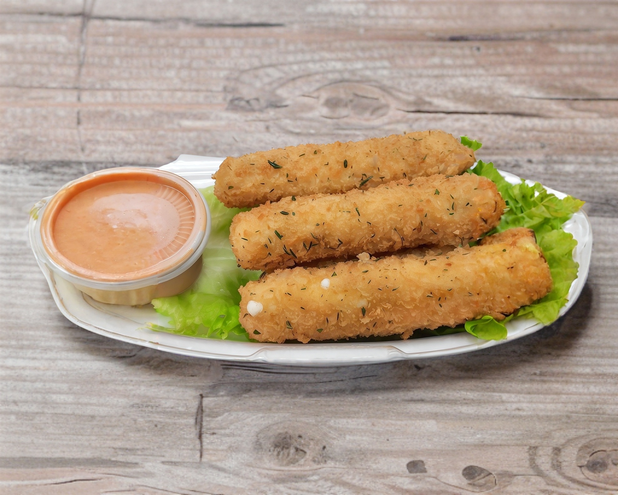 5 dedos de queso mozzarella empanizados y acompañados de aderezo.