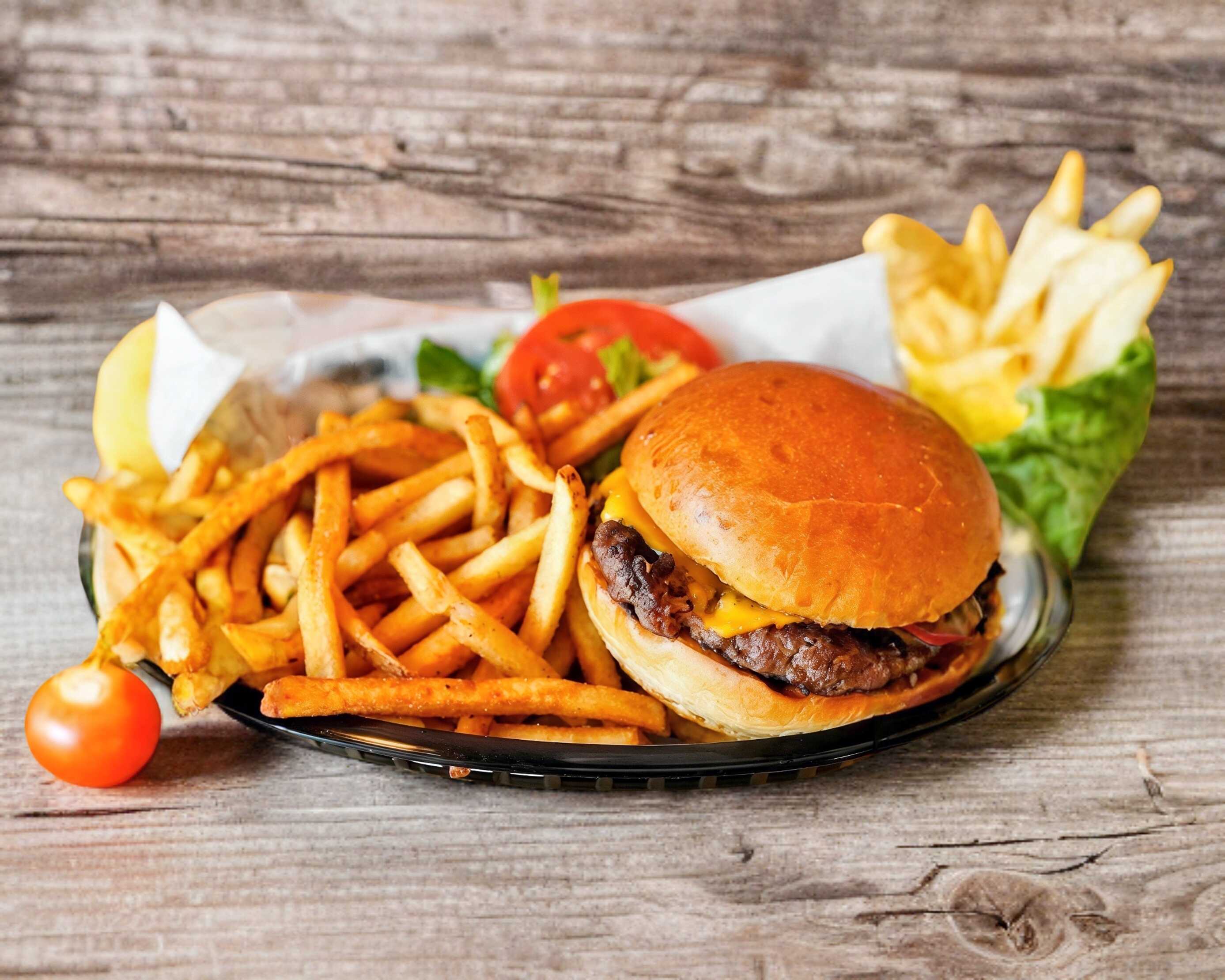 La hamburguesa de tu elección (pueden aplicar cargos extra) acompañada de una porción de papas a la francesa o papas gajo (100 gramos) y una bebida