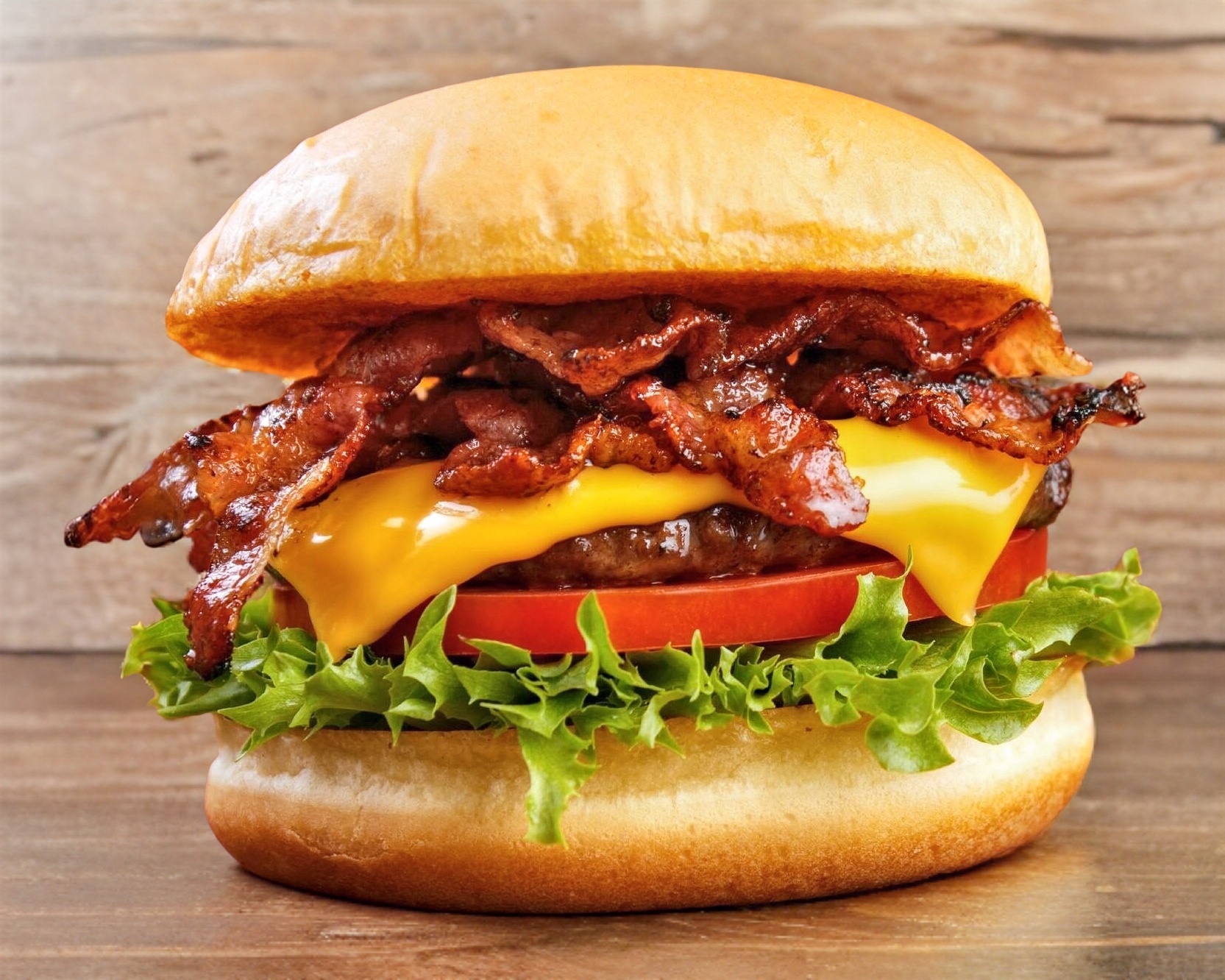 Hamburguesa de res (150 g), acompañada de doble queso suizo, doble queso americano, aderezo especial de la casa, verdura (jitomate, cebolla, lechuga y jalapeños) y 90g de tocino aproximadamente 6 rebanadas