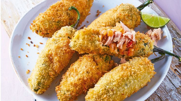 8 jalapeños rellenos de queso Philadelphia empanizados y acompañados de aderezo.