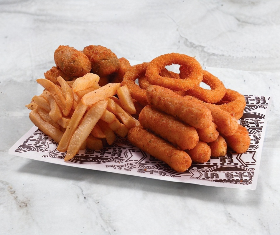5 dedos de queso mozzarella, 4 jalapeños rellenos, 250g de papas gajo, 8 aros de cebolla.