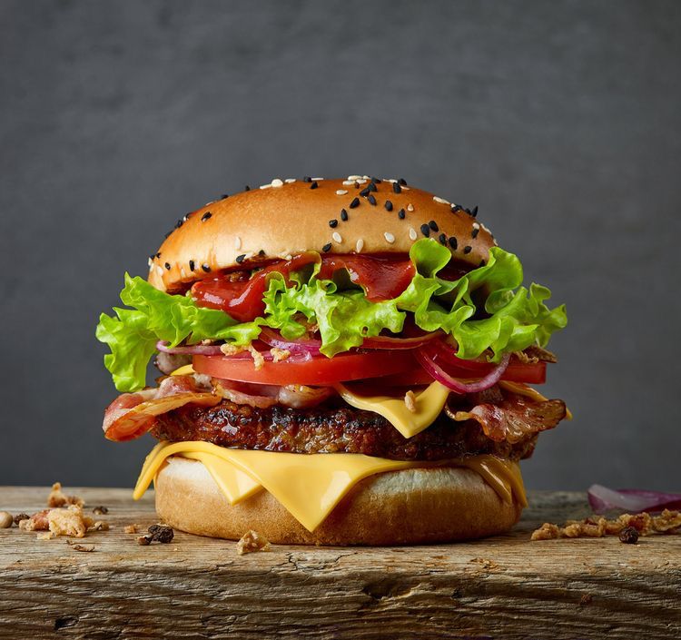 Hamburguesa de res (150 g), acompañada de queso suizo, queso americano, aderezo especial de la casa, verdura (jitomate, cebolla, lechuga y jalapeños), jamón y tocino