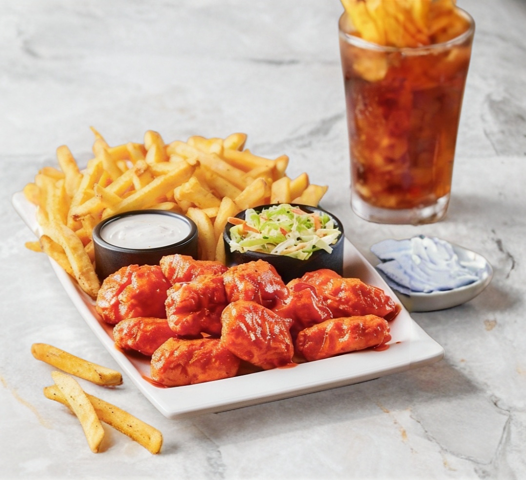 1 kg de bolitas de pechuga de pollo empanizadas bañadas en las salsas de tu elección (máximo 3), acompañados de papas a la francesa y aderezo ranch.