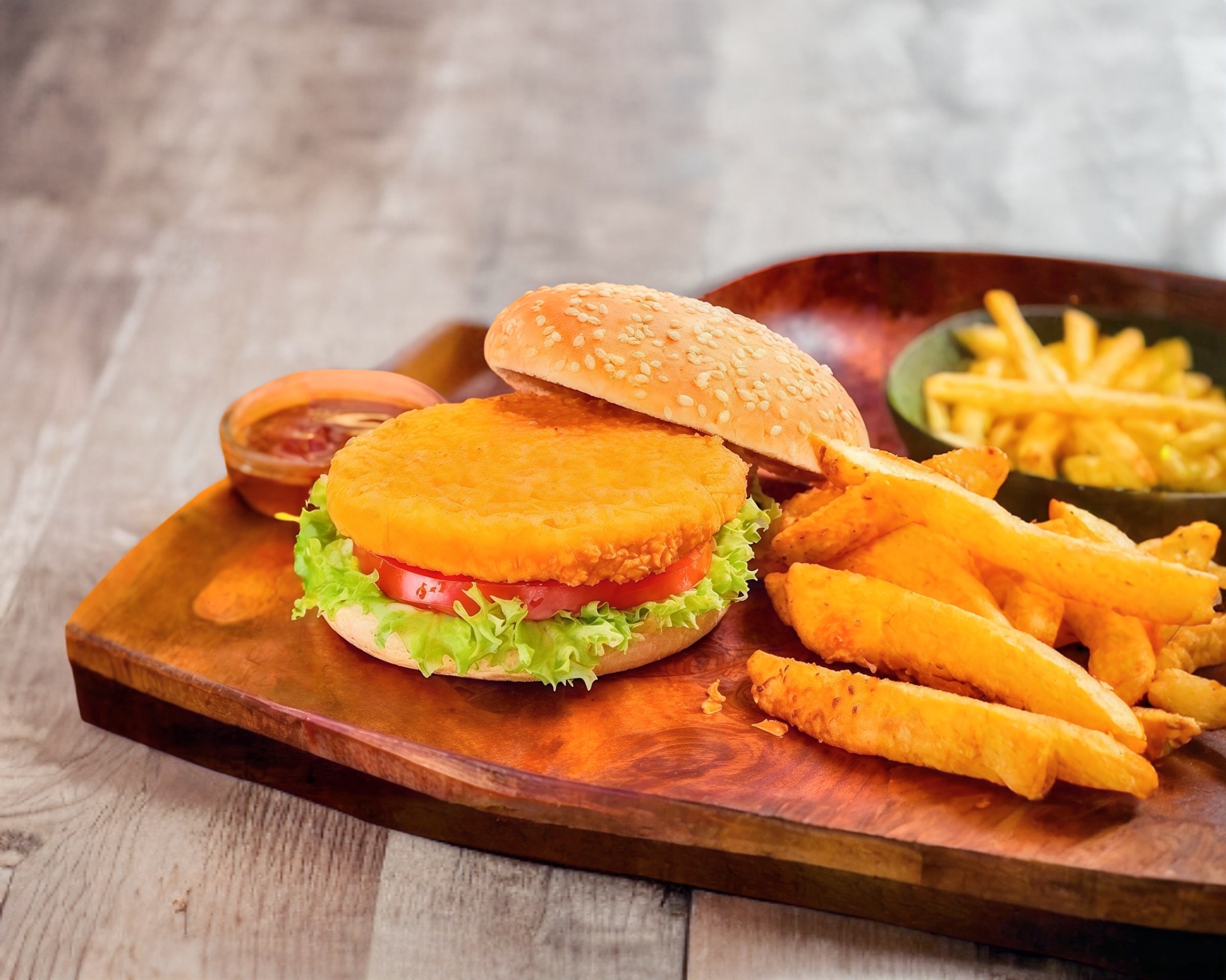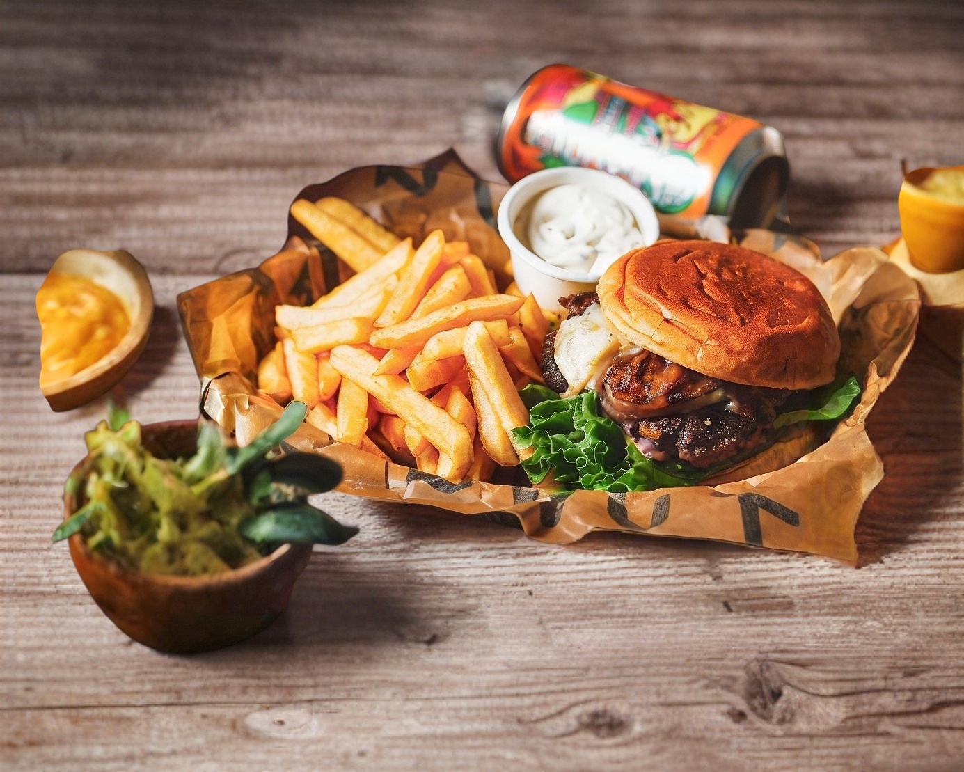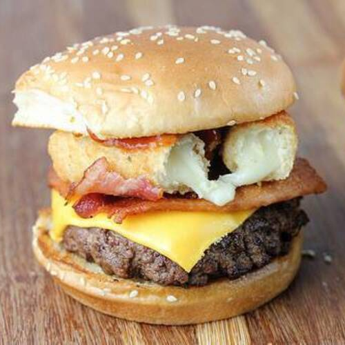 Hamburguesa de carne de res (150 g), preparada con queso manchego, queso amarillo, aderezos de la casa, verdura, dedos de queso mozzarella empanizados, tocino y salsa buffalo.