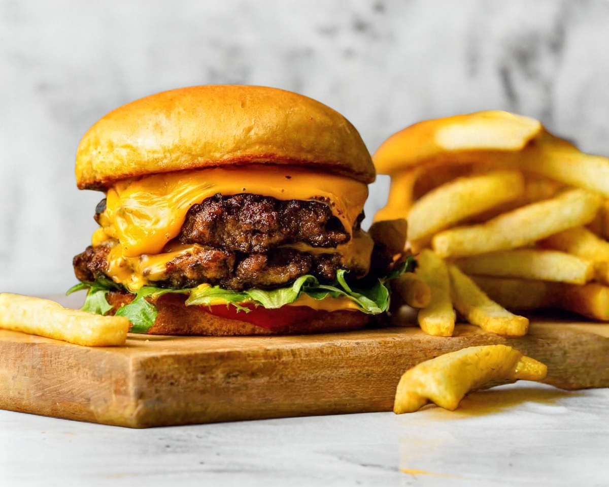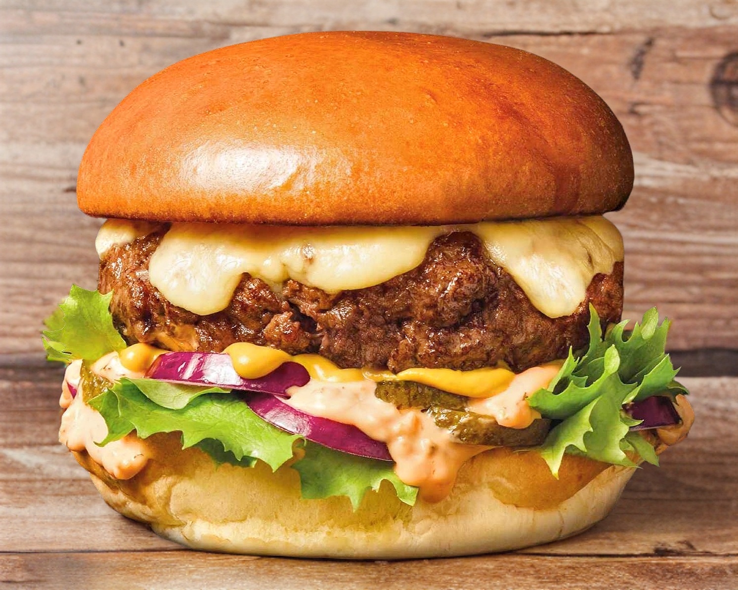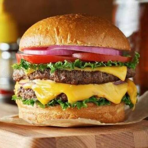 Carne de Res 150g acompañada de triple queso suizo, triple queso americano, aderezo de la casa y verdura.