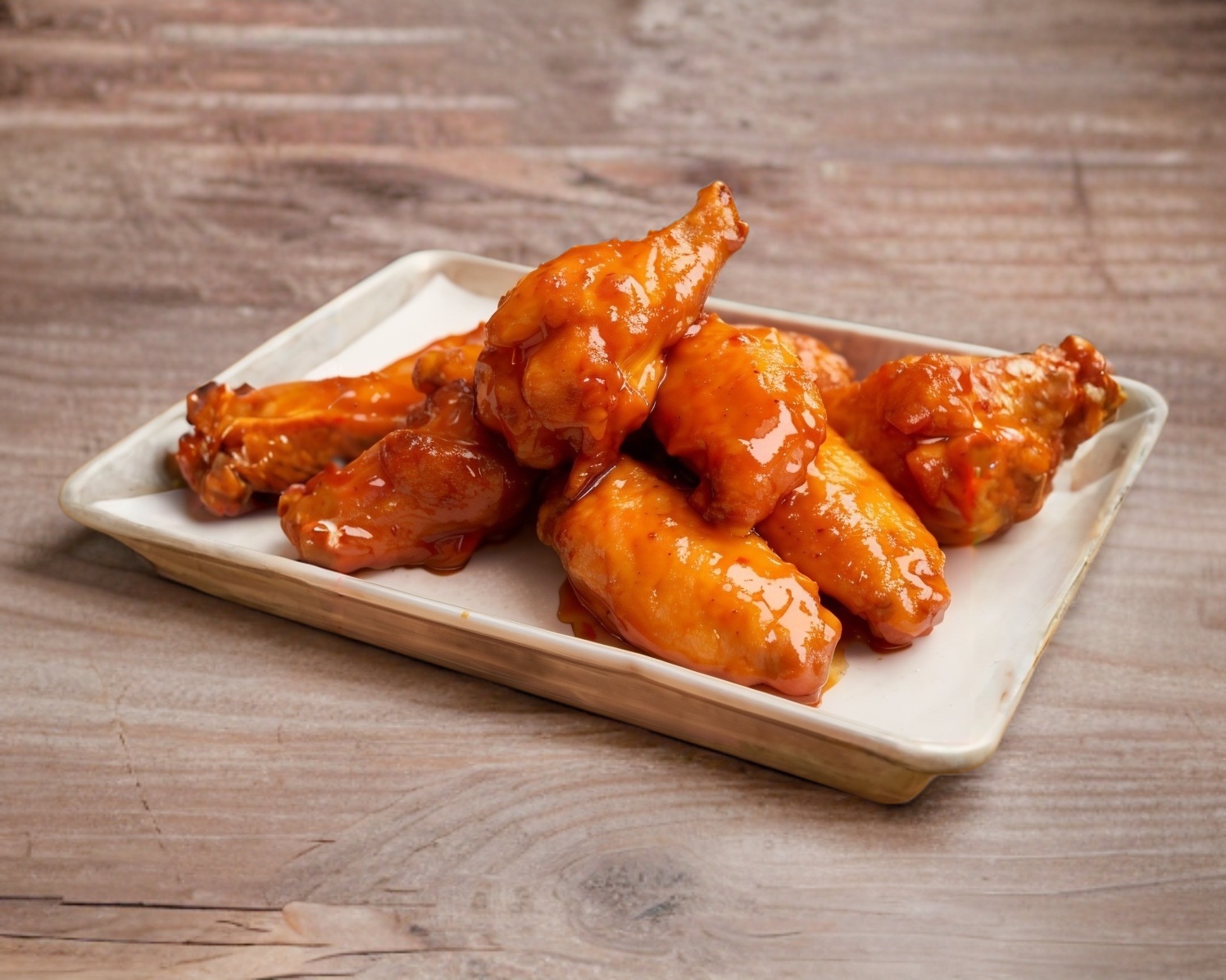 500 g de alitas de pollo bañadas en la salsa de tu elección (máximo 1), acompañadas de papas a la francesa y aderezo ranch.