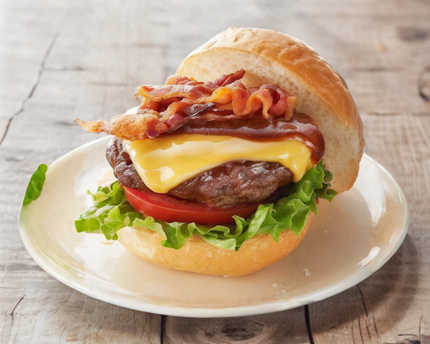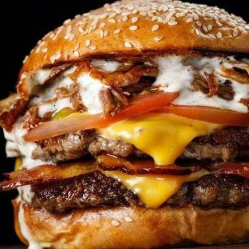 Doble Hamburguesa de res (150g), acompañada de doble queso suizo, doble queso americano, aderezo especial de la casa, verdura (jitomate, cebolla, lechuga y jalapeños) y 12 rebanadas de tocino