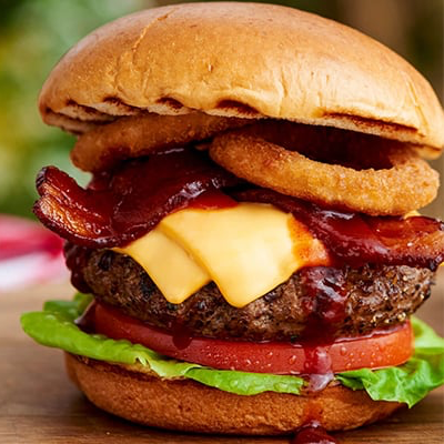Hamburguesa de res (150 g), acompañada de queso suizo, queso americano, aderezo especial de la casa, verdura (jitomate, cebolla, lechuga y jalapeños), jamón, tocino, aros de cebolla y salsa BBQ.