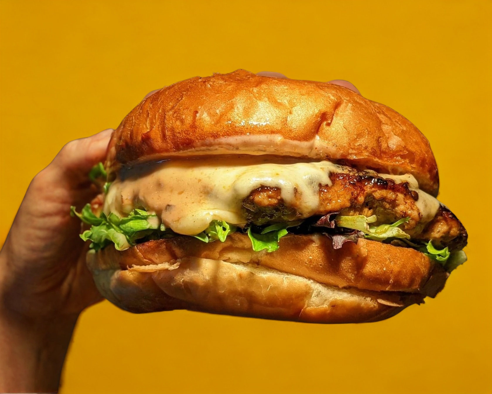 trozos de pechuga empanizados bañados en salsa al gusto y aderezos