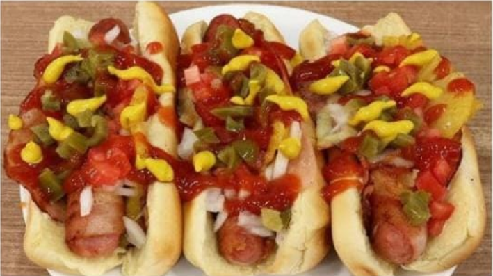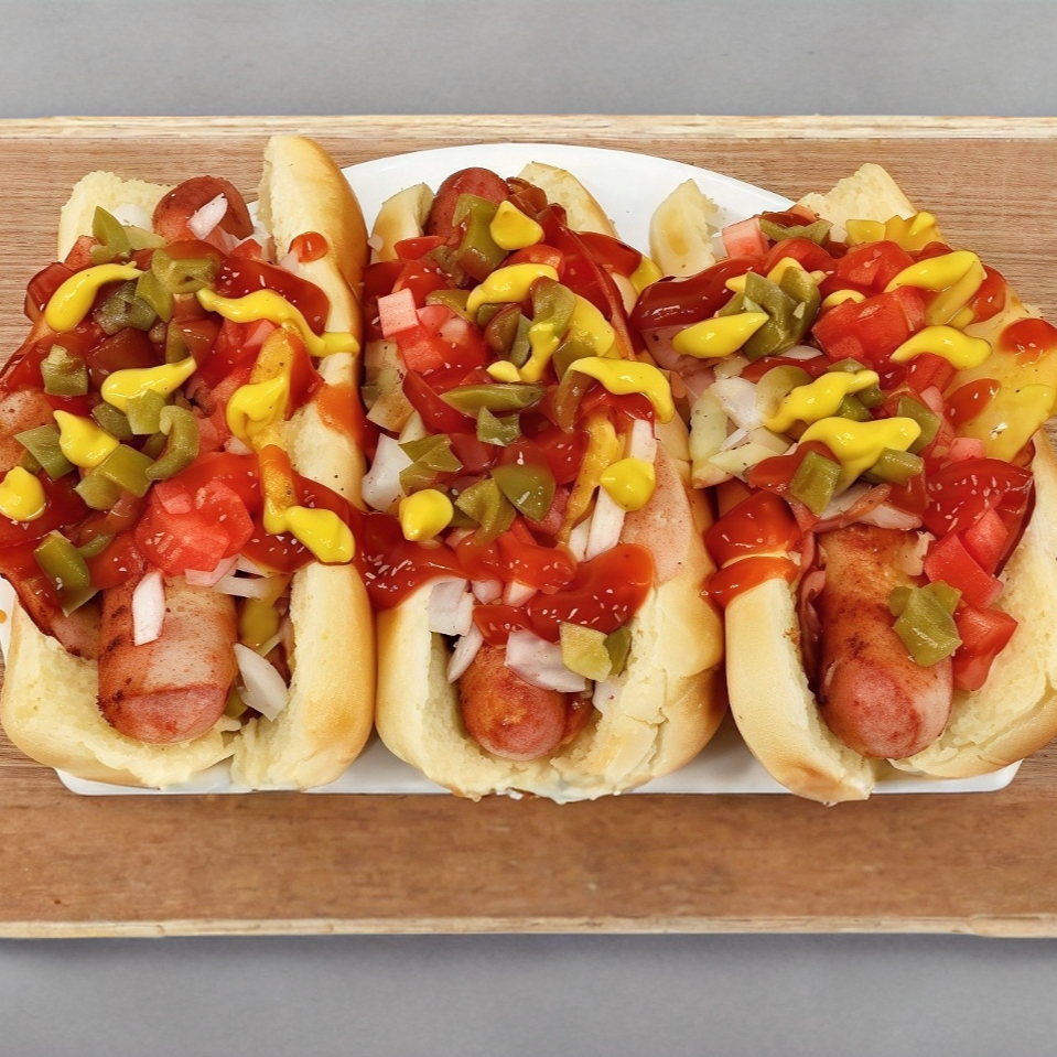 salchicha , chorizo, mezcla de quesos ( mozarella, oaxaca, manchego) jitomate, cebolla, chile y aderezos