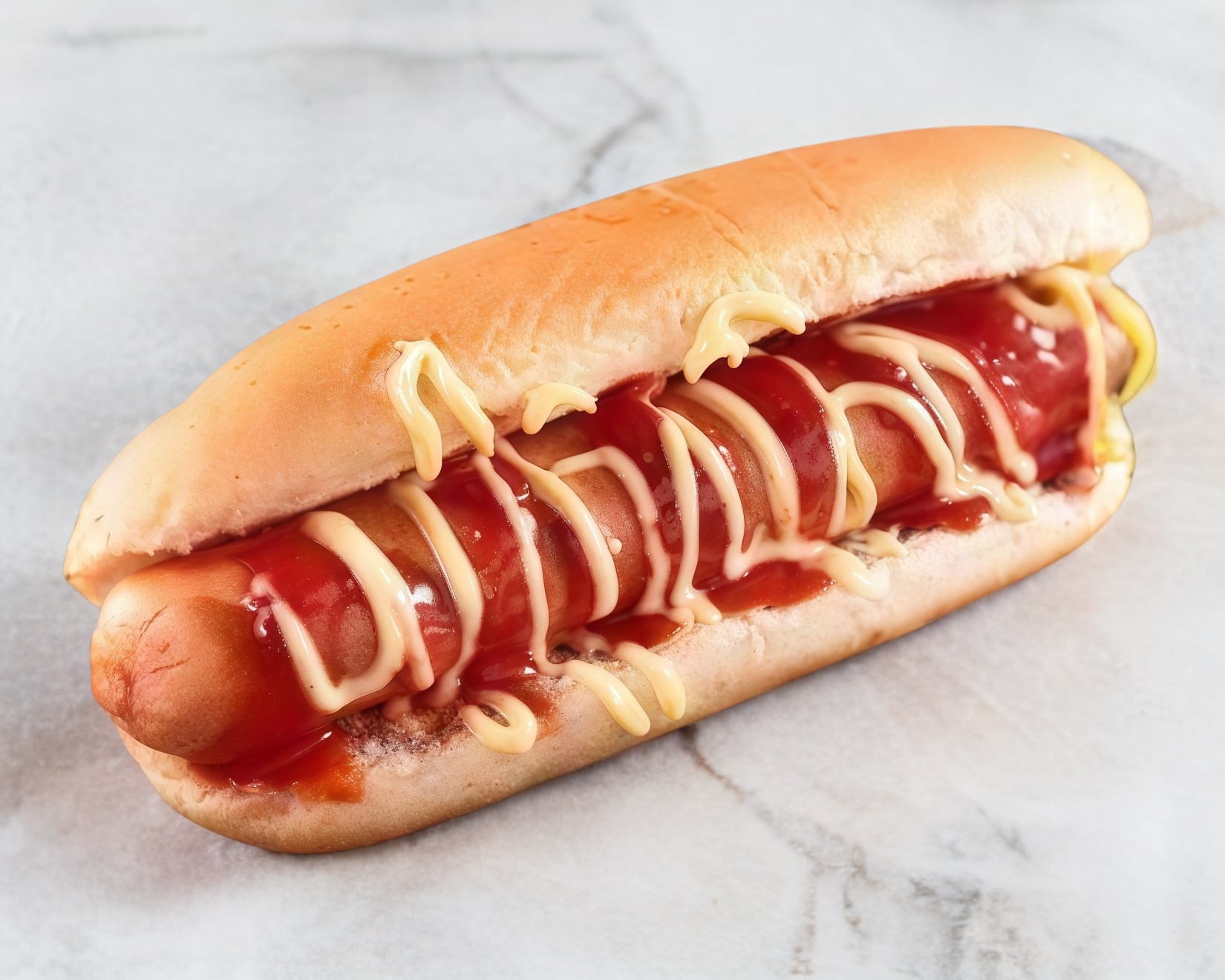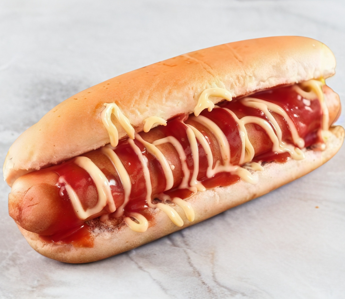 Hotdog con salchicha de pavo incluye jitomate, cebolla, aderezos