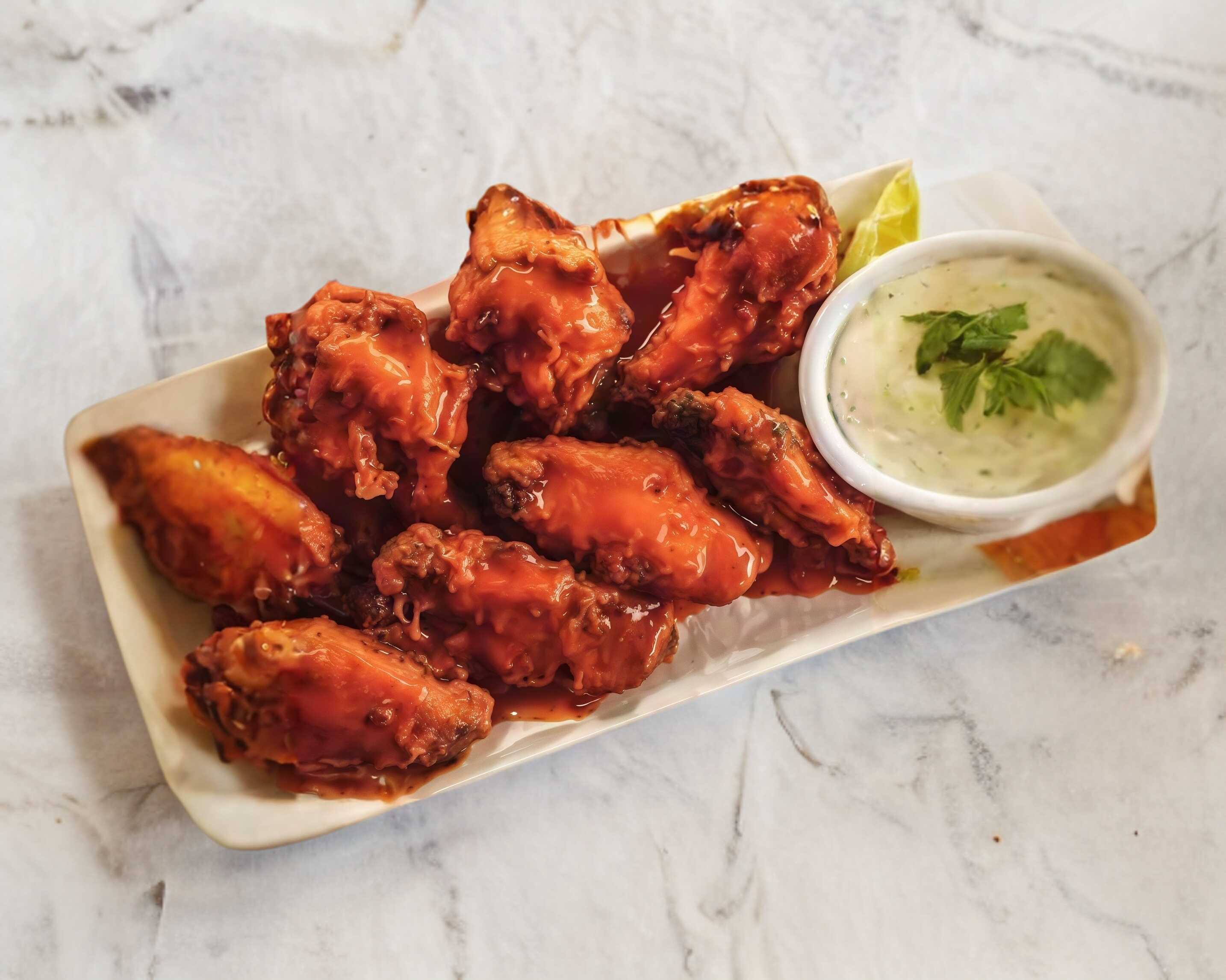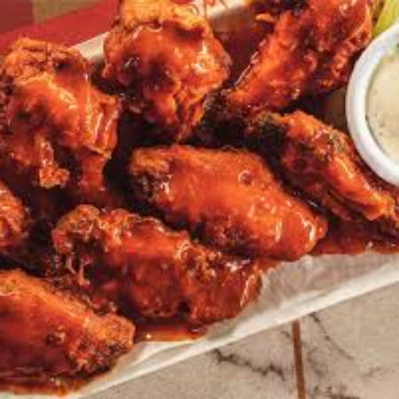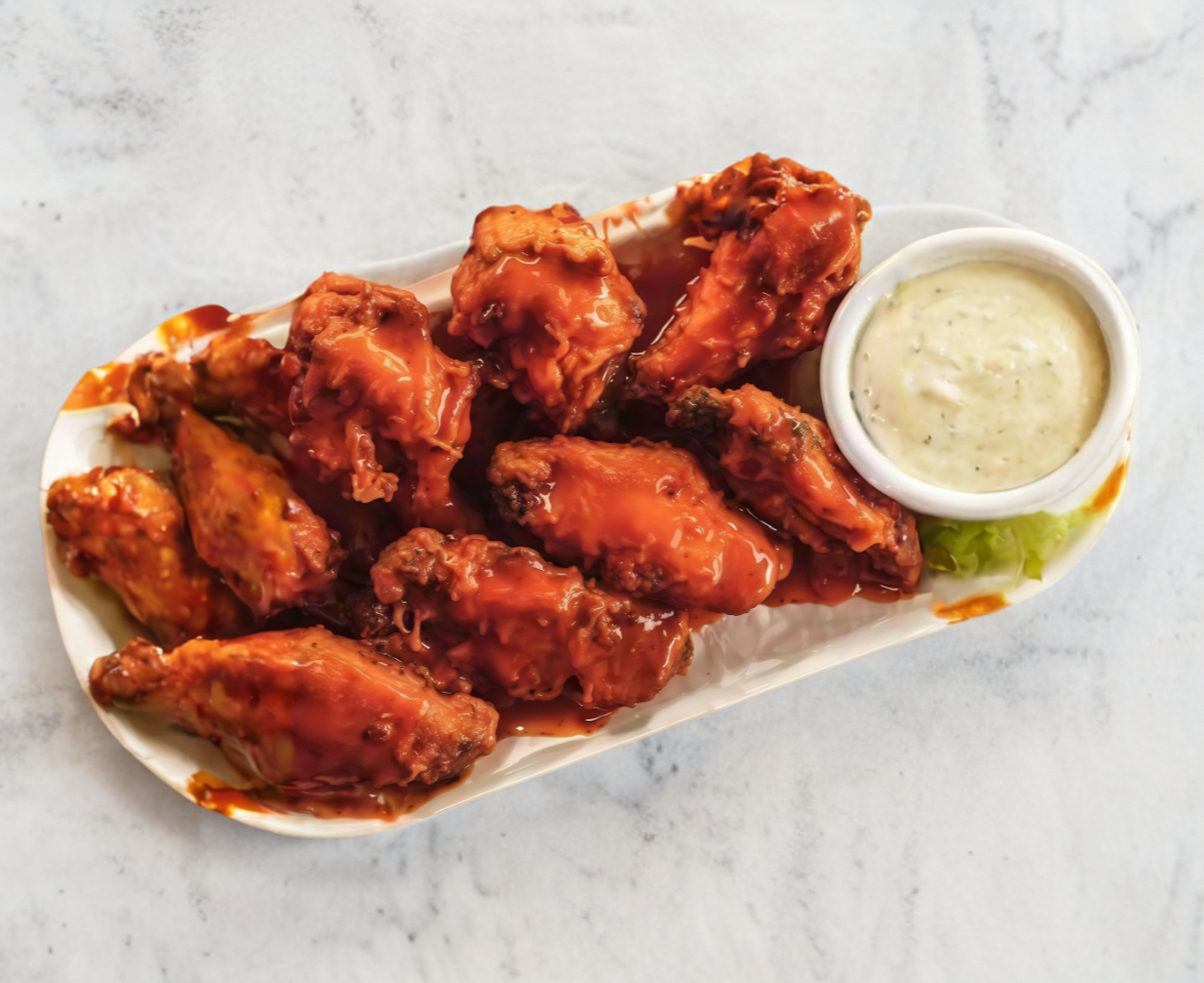 Alitas bañadas en salsa red hot picante 7 piezas incluye papas