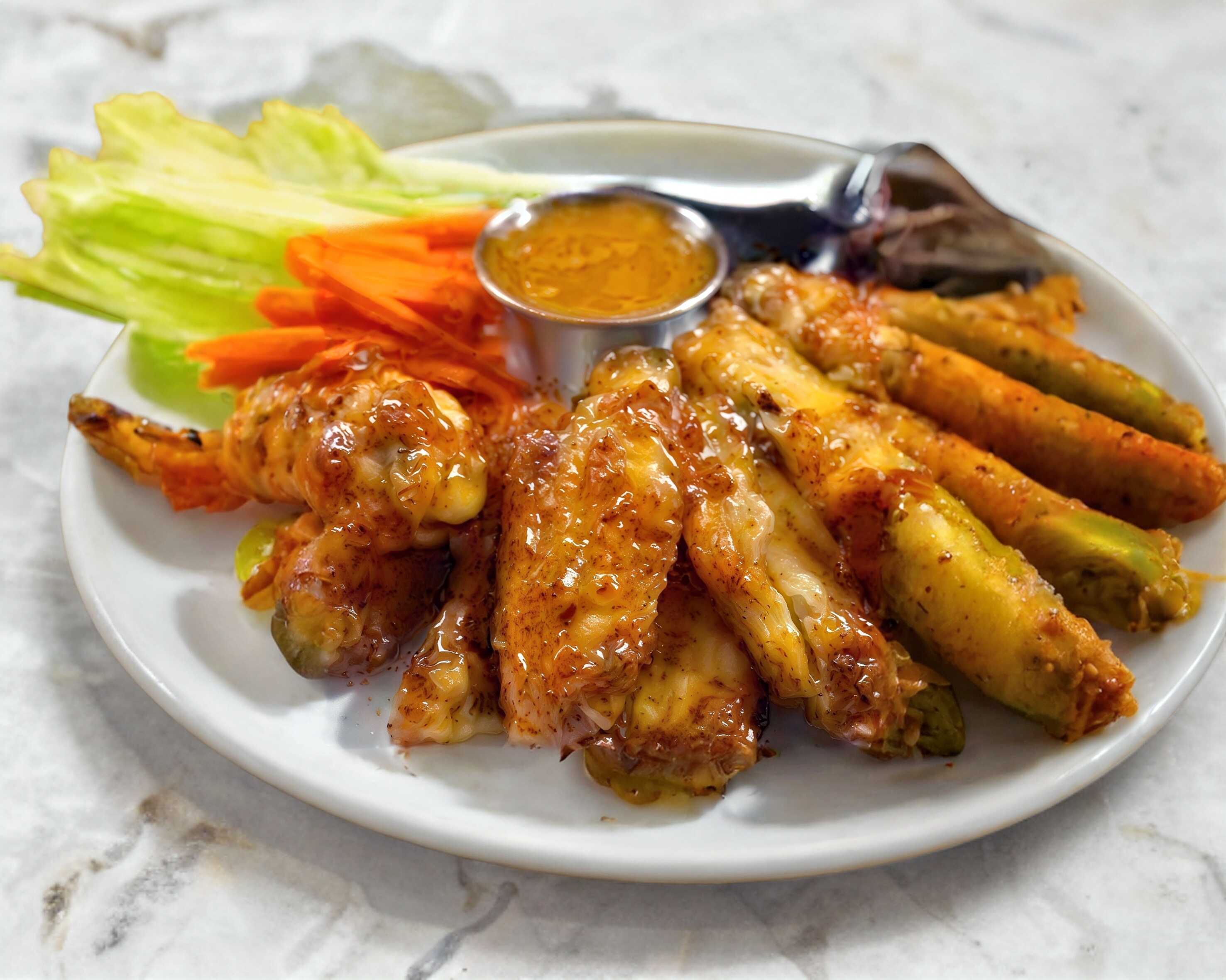 Alitas bañadas en salsa mango habanero 7 piezas incluye papas