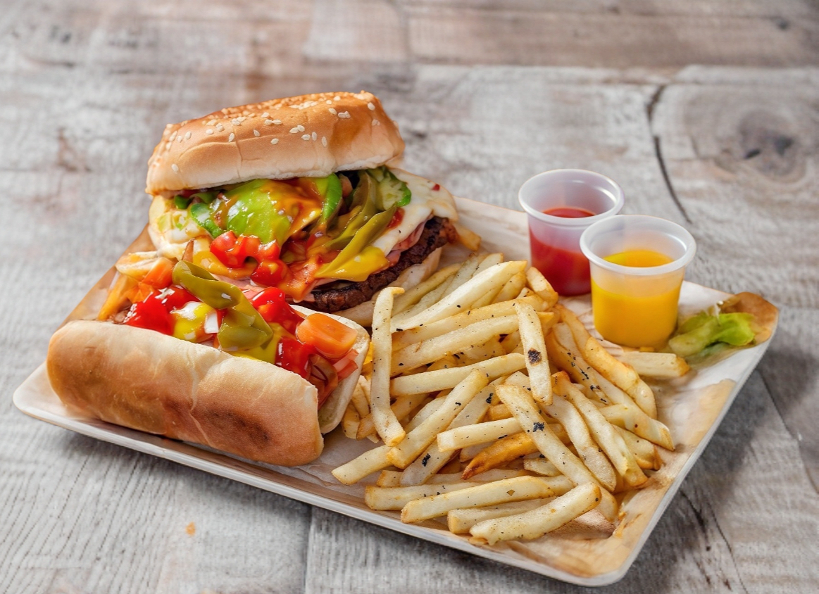 Hamburguesas con carne de res, jitomate, cebolla, chiles en vinagre, queso blanco, amarillo, pan grande, aguacate, cátsup, mostaza, mayonesa y papas.