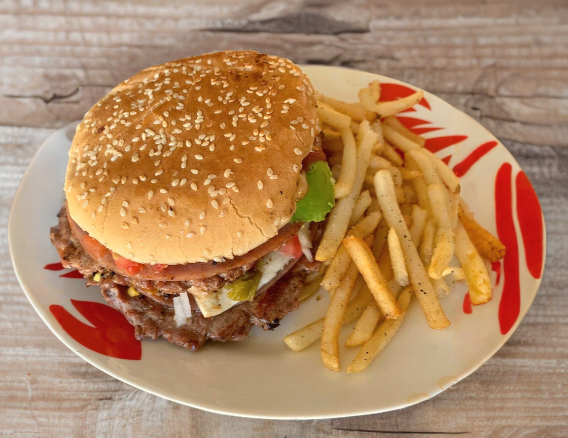Hamburguesas con doble carne de res, jitomate, cebolla, chiles en vinagre, queso blanco, amarillo, pan grande, aguacate, cátsup, mostaza y mayonesa.