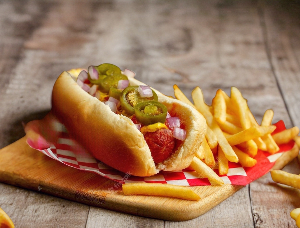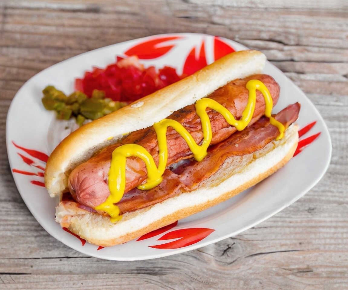 Hot-Dog con cebolla, jitomate, chiles en vinagre, catsup, mayonesa y mostaza