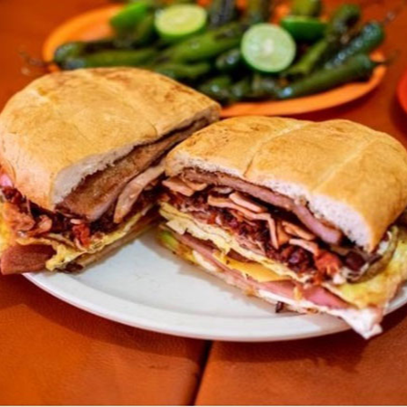 Carne de res, jitomate, cebolla, chiles en vinagre, jamón, queso blanco, amarillo, pan grande, aguacate, cátsup, mostaza.